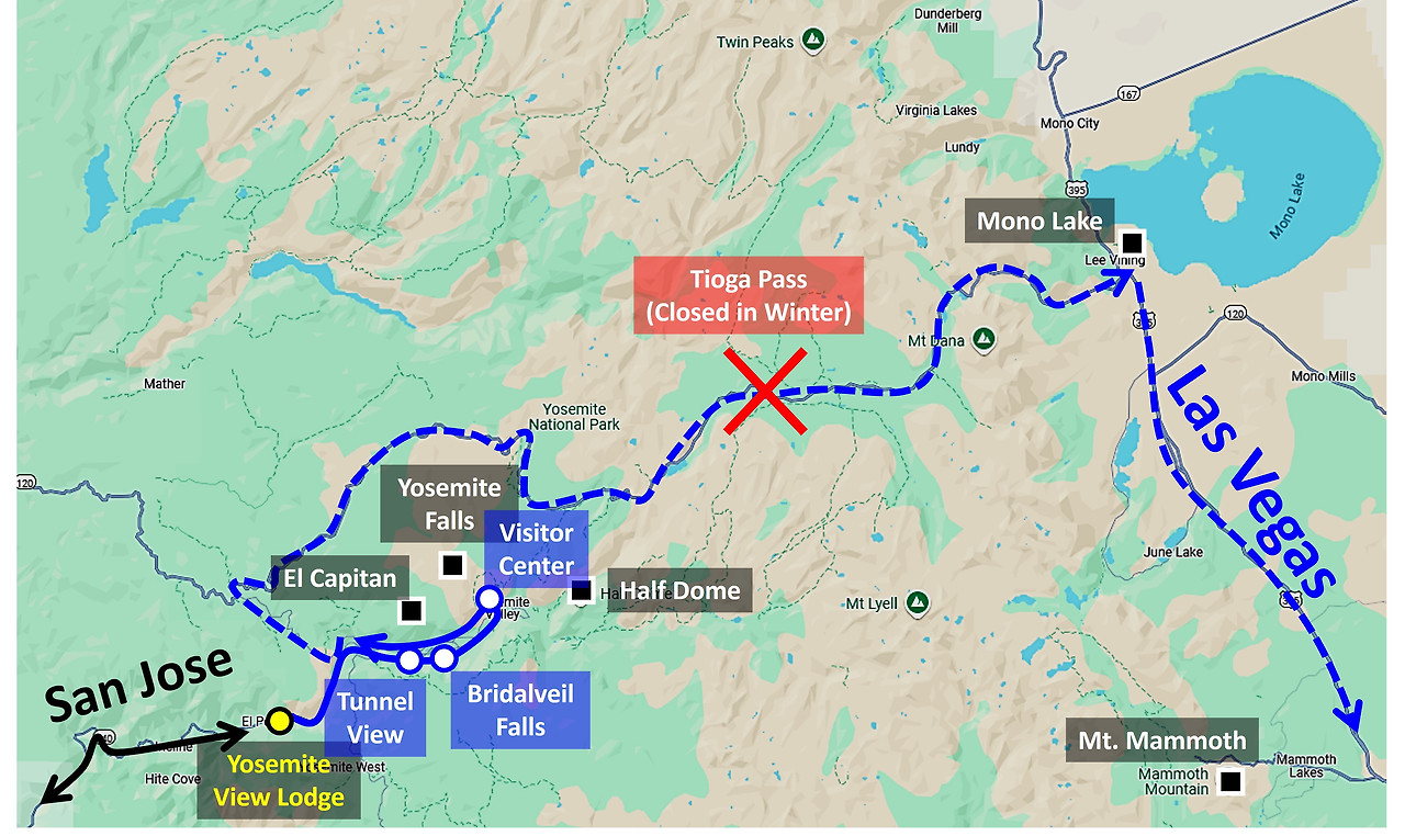 티오가 패스는 요세미티의 동쪽 고산 지대를 가로지르는 고갯길인데 이 길이 막히면 관광하려던 곳을 못 가는 것 정도로 끝나는 것이 아니다. 티오가 패스가 막히면 요세미티 동쪽으로 넘어가는 길이 없어지는 거여서, 다음 일정인 네바다로 가려면 요세미티 공원 전체를 남쪽으로 크게 돌아가는 길 밖에 없다. 즉, 2시간 거리의 길을 8시간 걸려서 가야 하는 상황이 된 것이다. 여유 있던 일정이 '이미 늦은 상황'으로 바뀌었다.