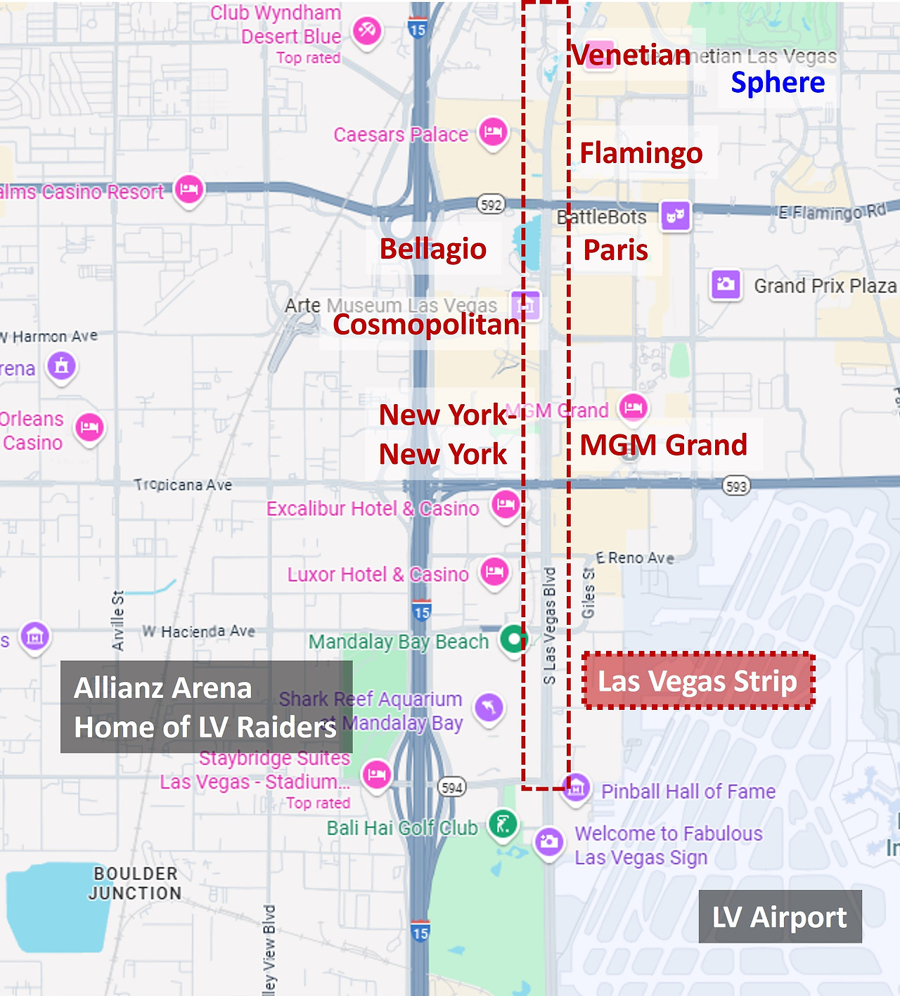 '라스베가스 스트립', 짧게 그냥 '스트립'이라고 부르는 이 지역은 라스베가스 대로(Las Vegas Boulevard)를 따라 길게 형성된 상업지구를 말한다. 유흥의 라스베가스가 시작된 곳으로 남쪽에 있는 라스베가스 공항에서부터 북쪽방향으로 무려 7km까지 이어진 길고 넓은 곳이다. (사실 라스베가스는 스트립뿐만이 아니라 그 주변 모든 곳이 카지노로 가득하다. 스트립이 가장 무난하고 가족적이고 매운맛, 어른맛을 느낄 수 있는 곳은 스트립 주변에 잔뜩 있다.)