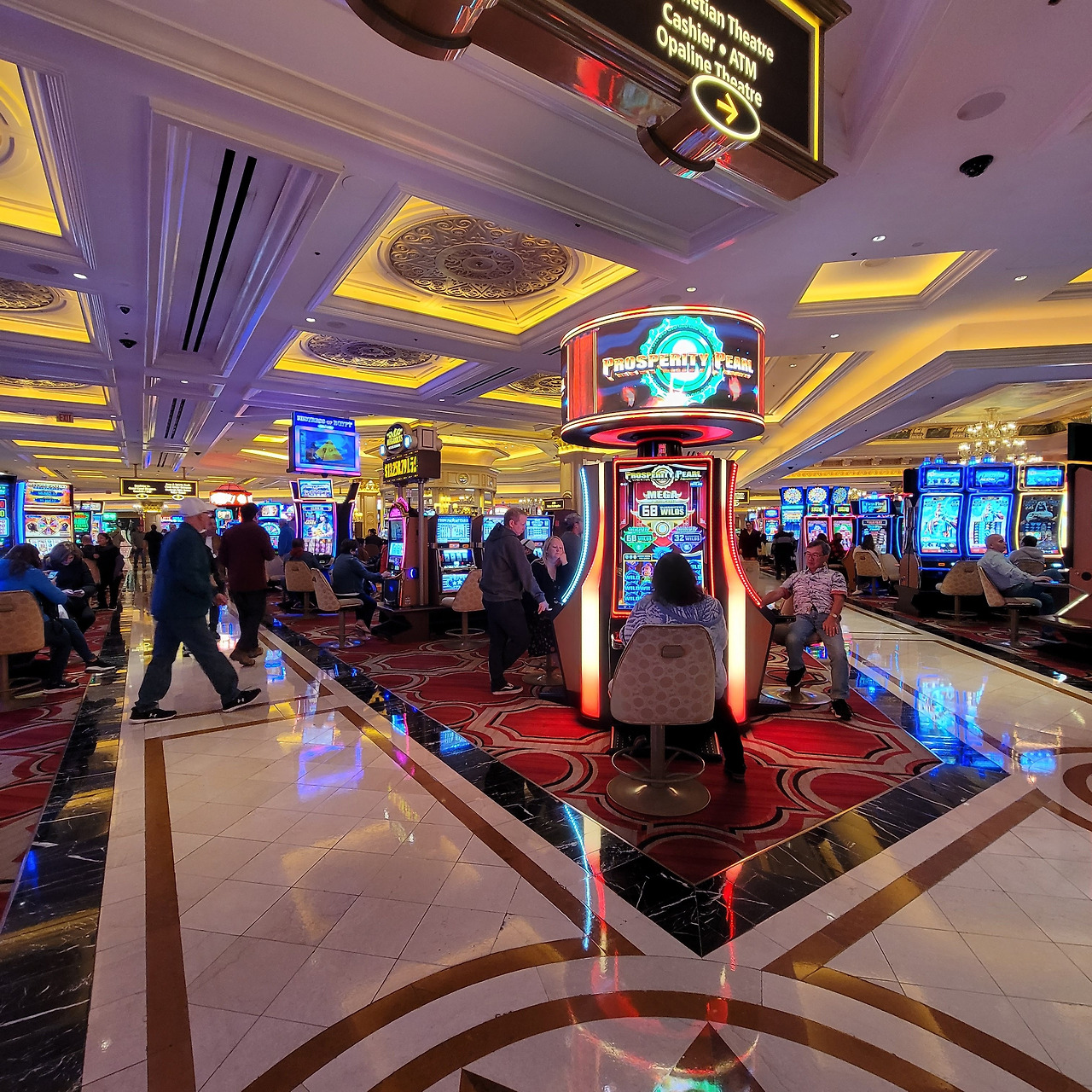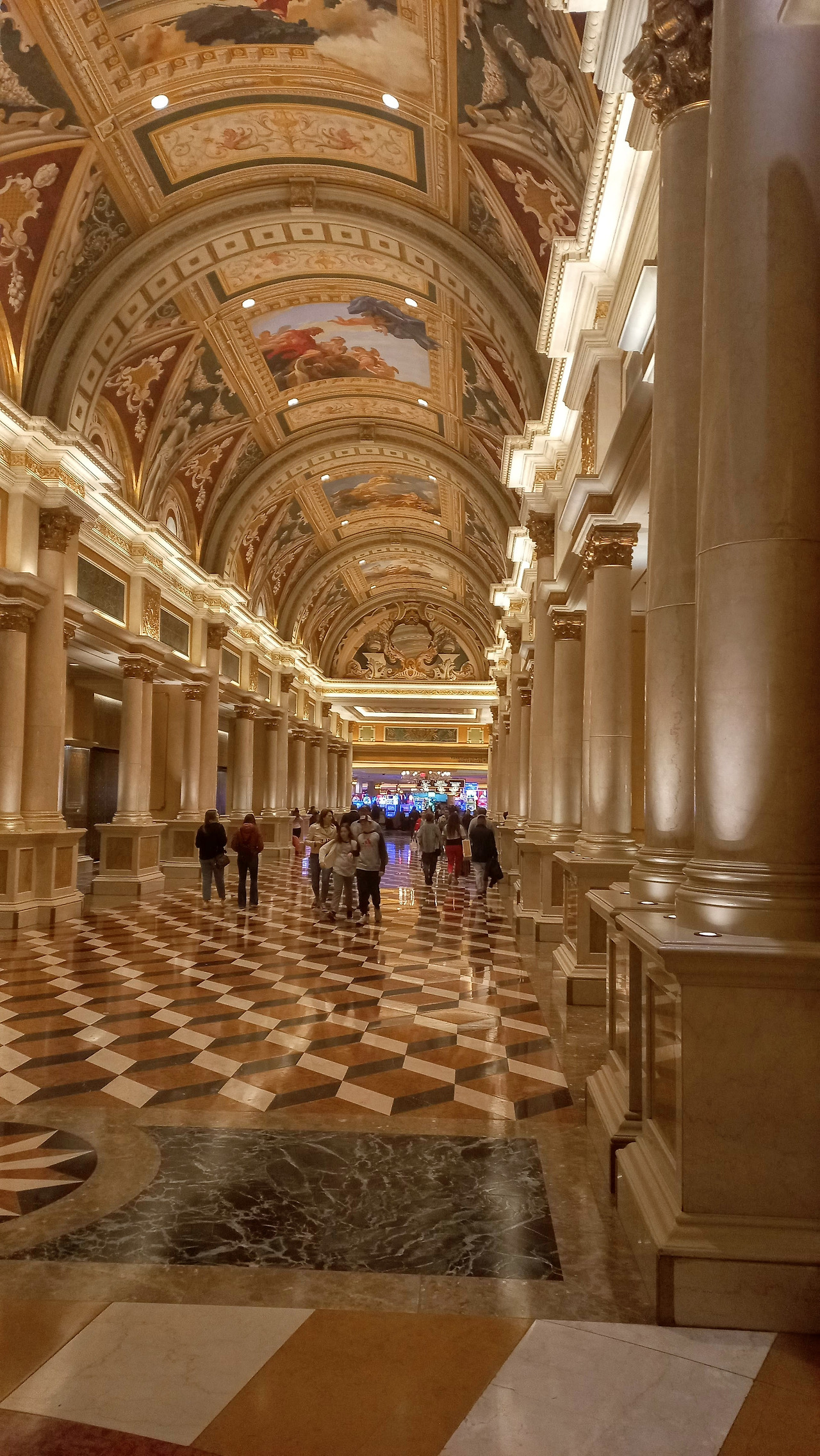 넓은 복도에는 호화로운 벽화, 천장에는 각종 유리공예로 꾸며져 있고 명품 상점이 즐비하다. 통로 한편으로는 가족끼리 사진을 찍을 수 있는 꽃으로 장식된 전시장도 있지만 또 반대편으로는 슬롯머신이 놓인 카지노 구역이다. 사진만 찍고 카지노는 얼른 지나가자.