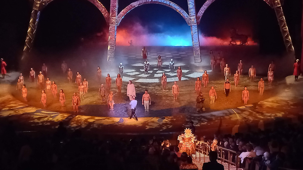 공연 내용에 따라 다이빙이 가능할 만큼 물이 깊게 채워지기도 하고 그냥 서 있을 수도 있는 보통의 무대가 되기도 한다. 방금까지 서서 연기를 하던 곳인데 높은 곳에서 배우가 갑자기 바닥으로 다이빙을 하는 장면은 정말 아찔하다.