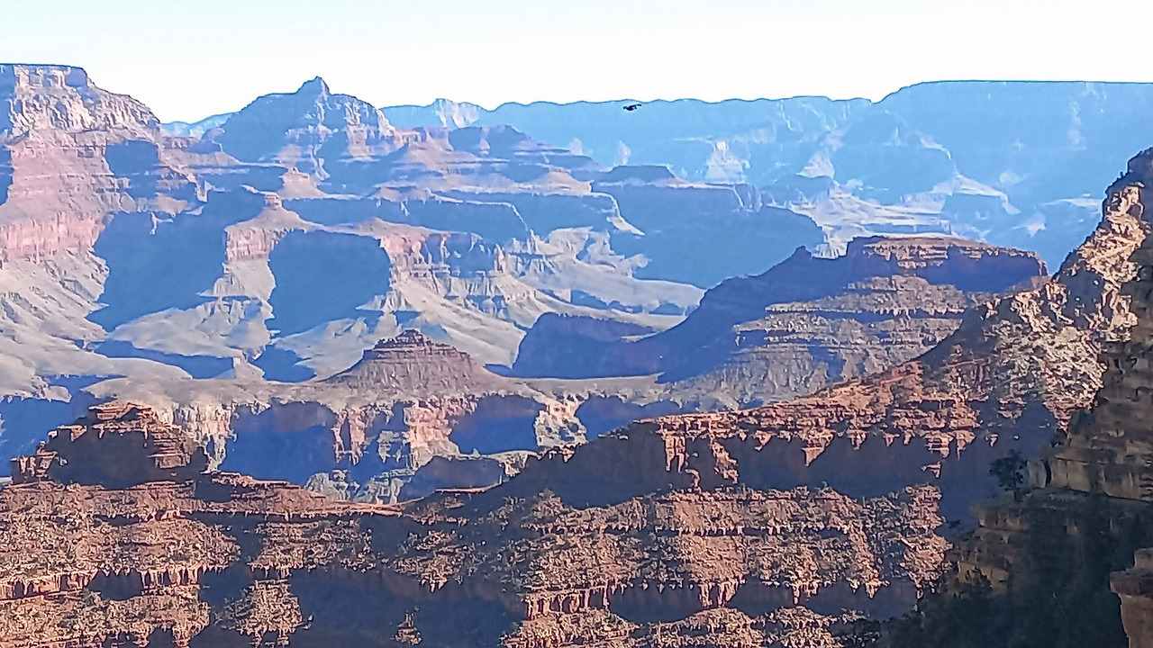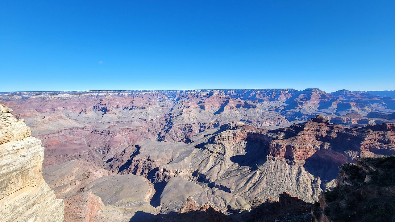 그랜드 캐년을 남북으로 걸어서 건너는 여행 코스도 있다고 한다. 하지만 정면(북쪽)으로도, 좌우(동서)로도 골짜기가 이어져 어디가 시작이고 끝인지 가늠이 잘 되지 않는다. 우리가 서 있는 사우스 림에서 맞은편 너머에 북쪽 입구인 노스림이 있을 테지만, 지평선 너머로 가려져 전혀 보이지 않는다. (사우스 림에서 노스 림까지 직선거리는 약 20km, 제주시청에서 서귀포시청까지의 거리와 비슷하다. 보이지 않는 게 당연하다.)