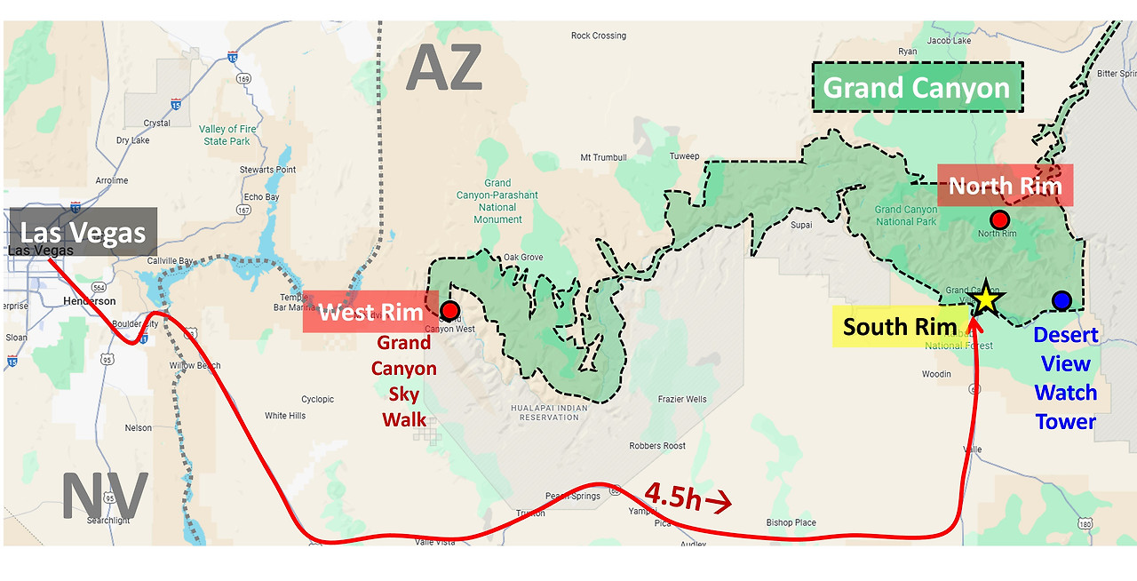 어마어마하게 광활한 그랜드 캐년이지만 여행자가 들어갈 수 있는 입구는 네 곳뿐이다. 남쪽의 사우스 림(South Rim), 동쪽의 데저트 뷰(Desert View, East Rim이라고 부르는 사람도 있다.), 북쪽의 노스 림(North Rim), 그리고 원주민 보호구역에 속하는 웨스트 림(West Rim).