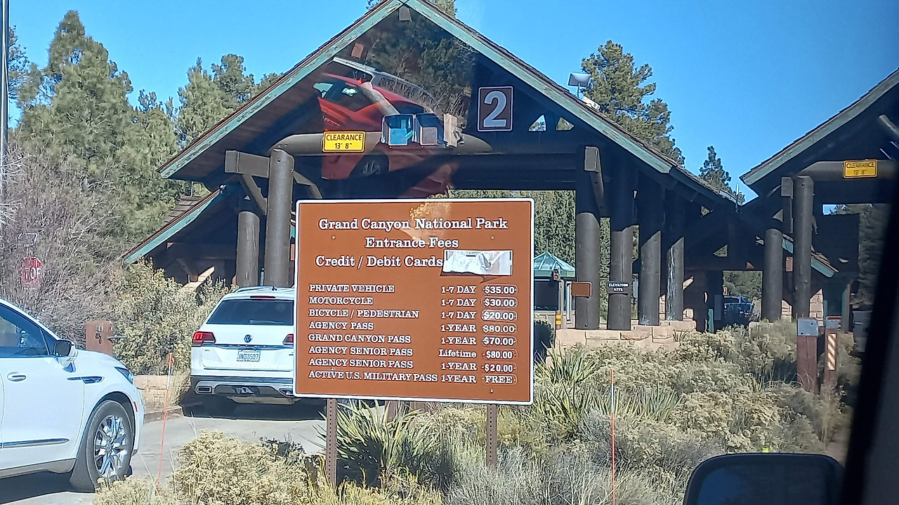모든 미국인의 휴가 시즌인 추수감사절이라 입장을 기다리는 차가 많다. 한참 기다려 우리 차례가 되었을 때, 매표소 직원은 Aiden에게 "투어 가이드인가요?"라고 묻고 Aiden은 "아니요"라고 답한다. 그리곤 일반차량 입장료 $35를 결재하는데 아내는 그걸 보더니 내 귀에 '역시 이럴 줄 알았어'란다. (패키지 투어 관행에 대해서는 아래에 설명)