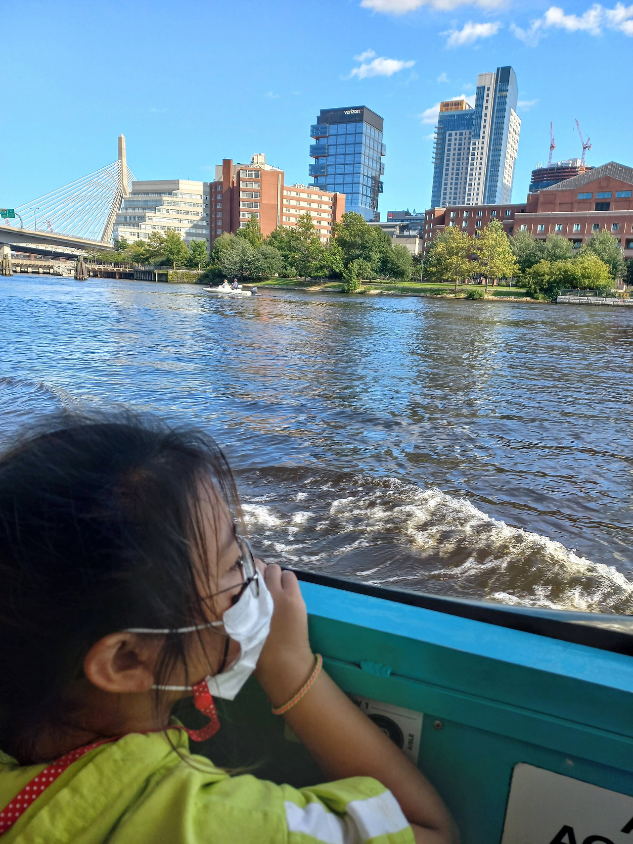 (왼쪽) 우리가 탔던 투어 버스. 버스 뒤편에 태극기가 붙어있다. 한국인 통역은 자주 있지 않다. (가운데) 찰스강 한 가운데를 지나고 있는 세은이.
