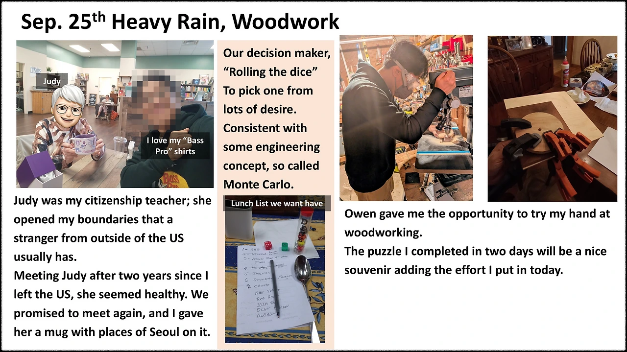 - 아침에 퍼즐이 완성된 것을 본 Owen은 한국에 가져갈 수 있게 작업을 좀 하자며 나를 지하로 데려갔다. 지하실에 있는 Owen의 목공실은 전기톱, 드릴 등 관련된 각종 장비가 어지럽게 널려있는 곳이다. 한쪽에 쌓인 적당한 크기의 나무판을 고르더니 그 위에 내가 맞춘 퍼즐을 풀로 봍인다. 그러더니 나무판을 퍼즐 모양에 맞게 갈아내야 한다며 '드릴 프레스' 쓰는 법을 알려주면서 직접 해보란다. 나무 타는 듯한 냄새가 긴장되고 자욱한 나무 먼지는 생전 해본 적 없는 경험이다. 눈이 동그래져서 신기해하는 내가 Owen은 그저 신기한가 보다. 그는 나무 먼지 뒤집어쓰고 있는 내 모습을 사진 찍어주었다.