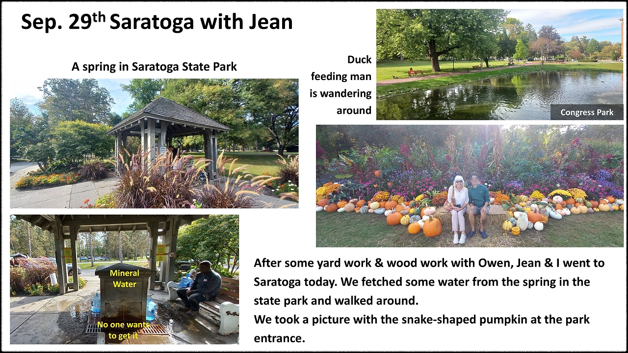 - 오후에 Jean은 '아무 할 일 없는 나'에게 사라토가 스프링스로 같이 가자고 한다. 물을 좀 받아와야 하겠다는 것이다. 30분 거리에 있는 사라토가 스프링스는 오래전부터 좋은 물이 나오는 곳으로 유명하다. 이곳의 물은 특유의 파란 병에 담겨서 보통 비싼 가격에 팔린다. 한국에서라면 '에비앙'급이랄까?