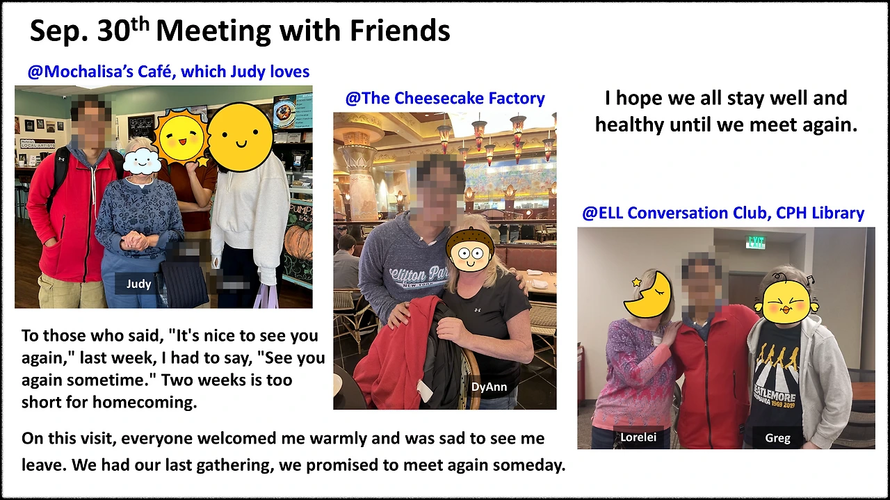 - Judy를 커피숍에서 다시 한번 만나기로 했다. Judy는 도서관 수업에 더 이상 나가지 않지만 개인적으로 알고 지내는 한국 이민자들을 만나는 자리에 나를 불러주었다. 나는 Judy가 여전히 활발하게 생활하고 사람들에게 도움을 주고 있는 모습이 안심되었다. Judy가 계속 이렇게만 지내준다면 우리는 반드시 또 만날 수 있을 거라는 확신이 들었다.