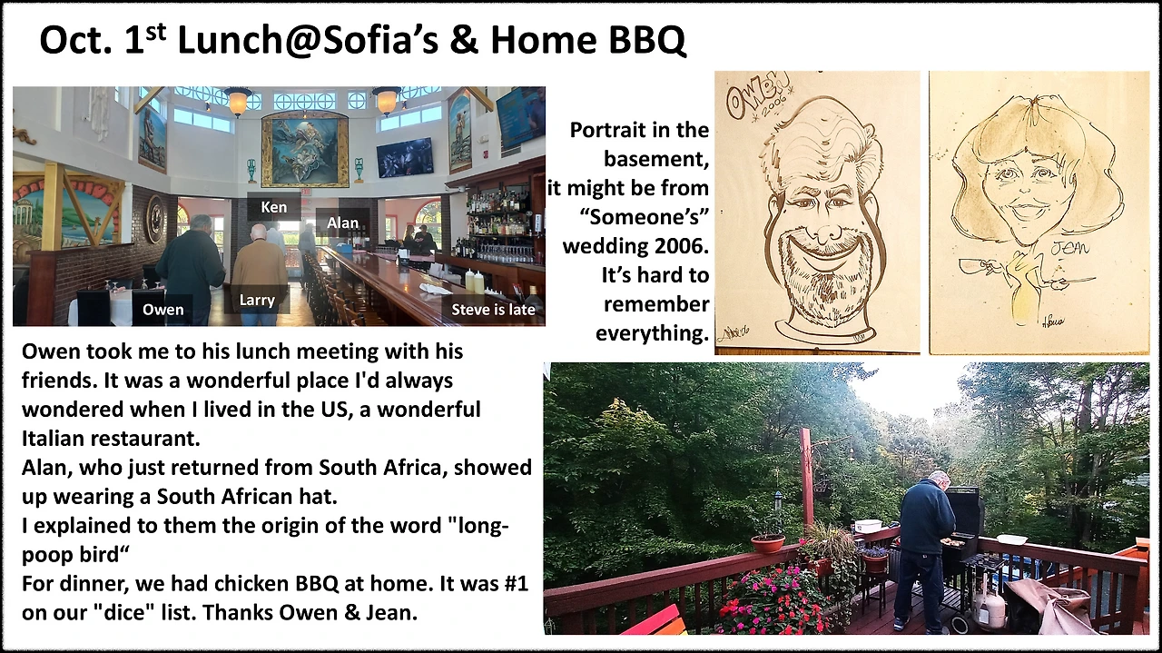 - 매주 수요일은 Owen이 친구들과 점심을 먹는 날이라 함께 집을 나섰다. 오늘은 동네에서 꽤나 고급으로 알려진 이탈리아 식당으로 왔다. 여기에 살 때, 아내와 보기만 하고 한 번도 와 본 적 없는 곳. 이렇게 Owen 덕에 결국 와보기는 하네. 생각해 보면 Owen이 친구들과 이렇게 매주 만남을 갖는 것이 부럽기도 하다. 목적 없이 매주 만날 수 있는 누군가가 내 주변에 있는가? 없다. 과거에도 없고, 지금도 없다. 내 노후의 삶이 Owen & Jean처럼 된다면 참 좋겠다는 생각이 든다. 'See you again someday'로 친구분들과도 작별을 고했다.