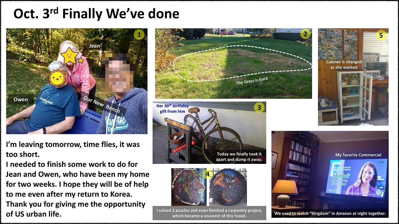 - 떠나기 전에 해야 하는 일을 생각해 보았다. Jean & Owen을 위해 해주고 싶은 일들은 이미 대부분 마무리되었다. 2주 전에 말라죽어있던 잔디는 다시 푸릇하게 되었고, 차고의 도어록도 고쳐놨고, Jean이 사용하기 불편하다고 했던 그릇장의 문도 바꿔달았고 페인트 칠도 잘 말랐다. Owen이 내게 선물한 퍼즐도 온전히 맞춰서 목공 작업까지 다 마쳐놓았다. 직소 퍼즐은 순전히 나를 위한 선물이지만, Owen은 경험 없는 내가 잘 해내는 걸 보고 싶어 했기 때문에 신경 써서 해냈다. 그리고 Owen이 많이 신경 썼던 벤치 새로 만들기도 완벽하게 끝났다. Jean은 이 벤치엔 내 이름을 적어놓아야 한다고 했다. 나의 벤치.