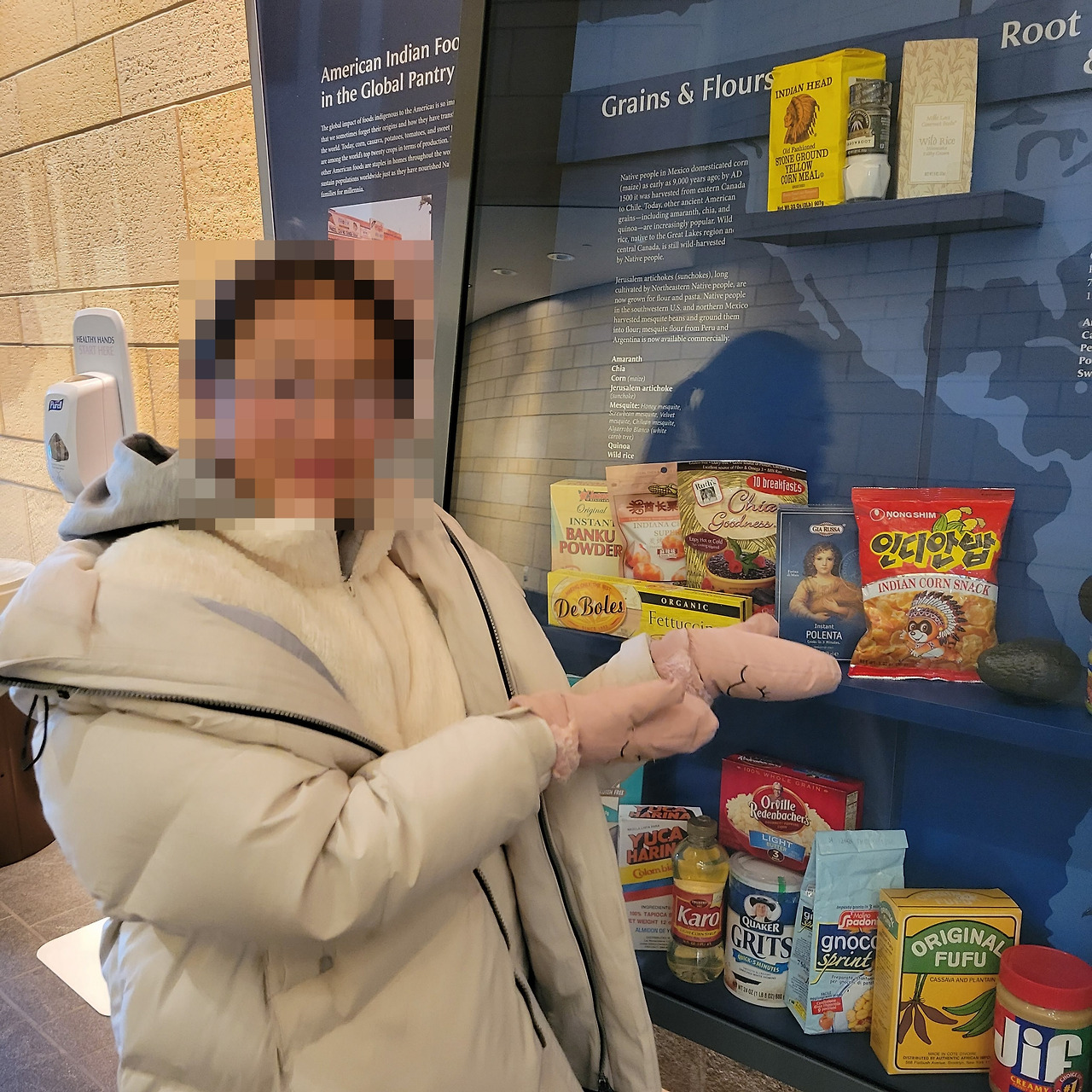 한참을 앉아서 쉬고 점심을 먹으러 가는 길에 세은이가 재밌는 걸 발견했다고 한다. 1층 식당으로 가는 길에는 세계 속 미국 인디언 음식(American Indian Food in the Global Pantry)을 소개하는 코너가 있다. 미국 원주민들이 주로 먹던 농작물로 세계 각국에서 만들어진 식품들을 소개하는 곳이다.
