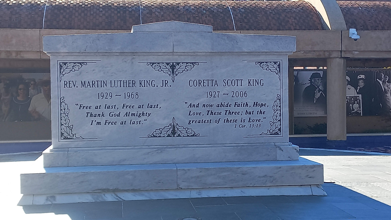 Freedom Hall 앞에 길게 조성된 Reflecting Pool 위에 놓인 킹 목사 부부의 묘는, 그들이 살아온 삶의 굴곡과는 대조적으로 굉장히 평화로운 인상을 준다. MLK의 묘에는 '마침내 자유로워졌다 (I'm free at last. MLK의 연설문에서 발췌한 것)'라는 비문이 새겨져 있는데, 이 문장은 그가 평생 짊어졌던 사회적 억압에서의 해방뿐 아니라, 한 개인으로서 감당해야 했던 무거운 과업을 내려놓았다는 의미로도 읽힌다. 그의 아내인 Coretta가 선택했을 이 문장, 그리고 장례식 사진 속 그녀의 표정을 함께 떠올려 보면 그 짧은 문장 안에 그녀가 가졌을 회한의 깊이가 더욱 크게 다가왔다.
