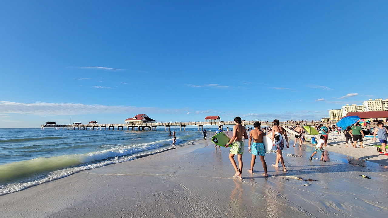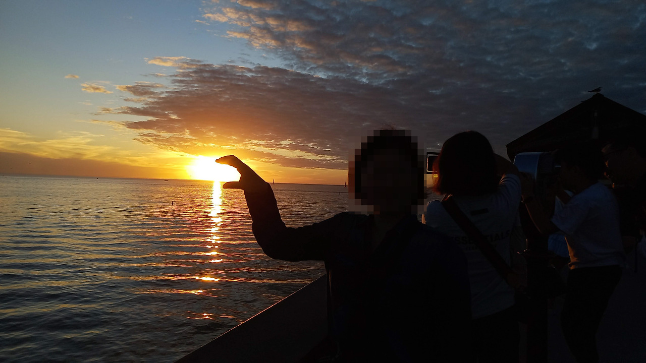 우리가 오후에 클리어워터 비치에 온 이유는 사실 석양을 보기 위해서다. 동쪽 해변에서 일출을 본 적이 있으니 서쪽 해변에서는 일몰을 봐야지. 미국의 유명한 해변이라면 바다를 향해 길게 뻗은 나무 부두, 피어(Pier)가 있기 마련이다. 역시나 클리어워터 비치에도 피어들이 있고 그중에도 피어 60이 가장 번화하다. 주변엔 기념품, 간단한 먹거리 등 즐길거리가 많다. 우리는 본격적으로 해가 지기 전에 바다를 향해 길게 뻗은 피어를 따라 많은 사람들 사이에서 좋은 자리를 먼저 잡았다. 다행히 오늘 구름이 그렇게 많지는 않다.