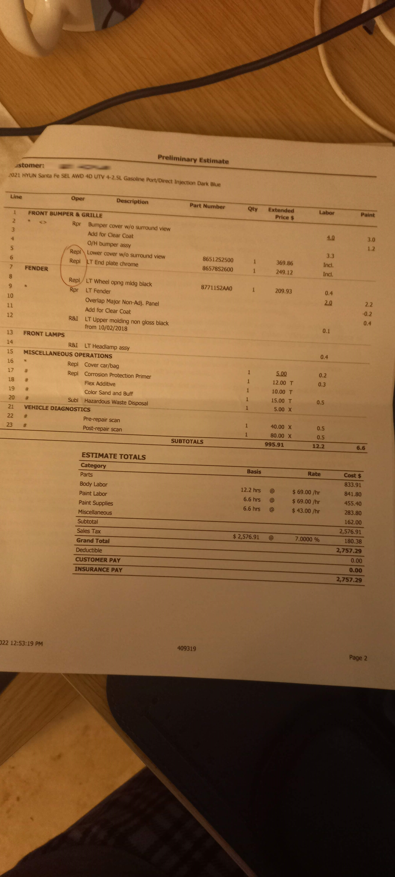 차 상태를 보니 부위가 넓지만 약간의 흠집 수준인데 한국이라면 수리 안 하고 타도 괜찮을 것 같은 정도다. 그리고 미국 도로 위에는 이것보다 훨씬 심한 상태로 망가진 차들이 다니는 것도 많이 봤다.