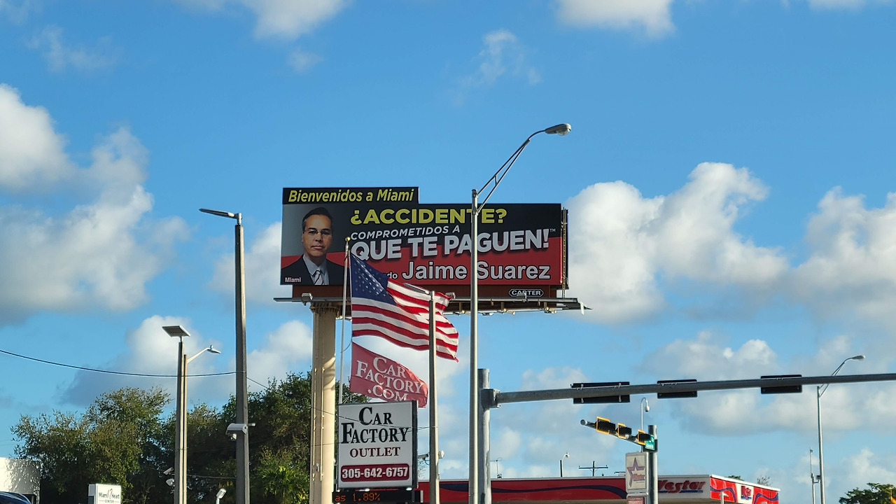 (사진) 리틀 하바나 근처의 변호사 광고판. 영여는 아예 없고 스페인어로만 쓰여있는 곳이 많았다. (왼쪽) 리틀 하바나 SW 8th St. 거리 곳곳에 세워져 있는 수탉 조각상. (오른쪽) 창문이 철창으로 되어있는 리틀 하바나 거리의 식당. 칼레 오초라는 이름엔 특별한 의미는 없고 스페인 어로 '8번 거리'라는 뜻이다. 영어로는 사우스 웨스트 8번 거리(Southwest 8th Streeet)다.