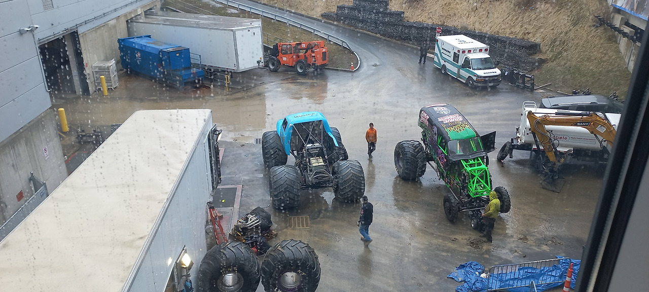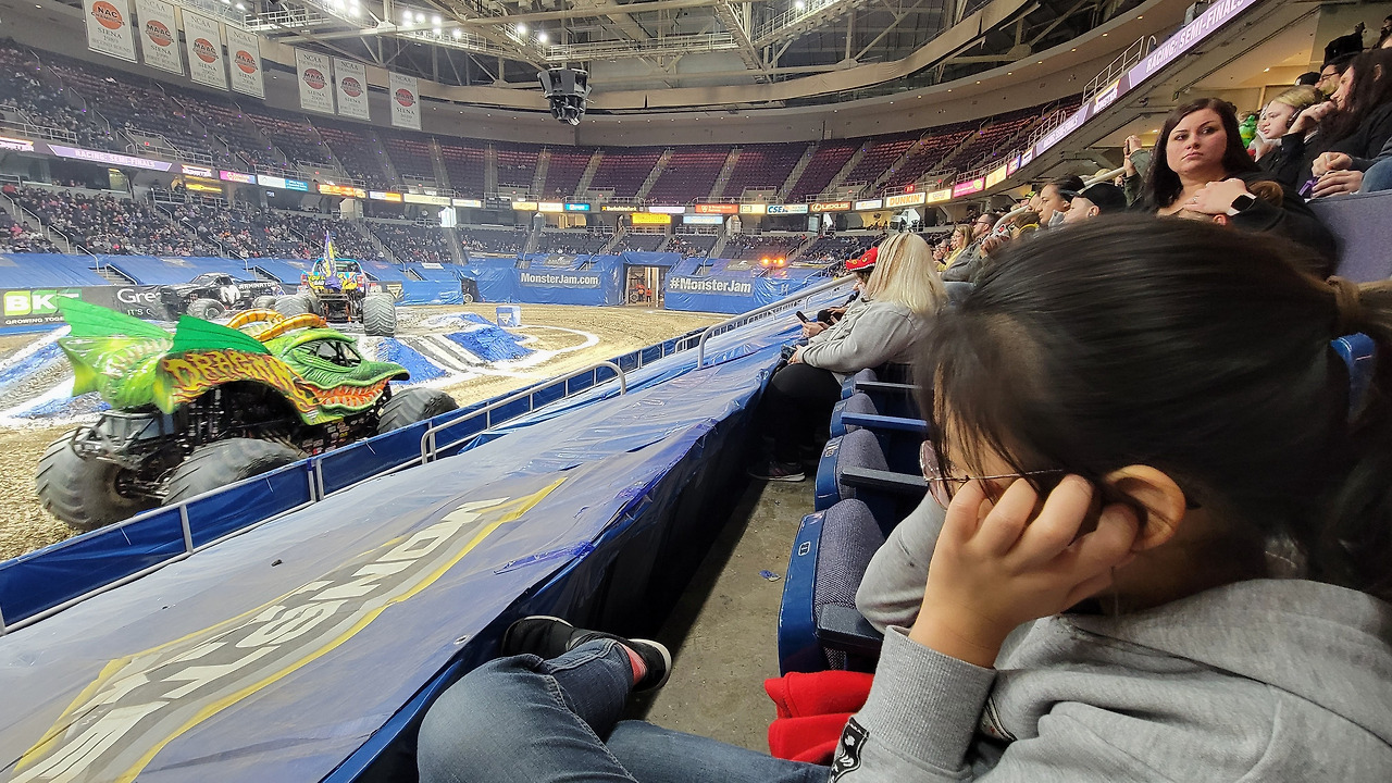 오늘 출전 트럭은 총 6, 한 대씩 소개되어 나올 때마다 폭죽이 터진다. 그중엔 여성 드라이버도 있다. 장내 아나운서는 그동안 코비드 때문에 오지 못했는데, 몬스터 잼 30주년인 올해엔 알바니로 올 수 있어서 다행이라고 한다. 전체 2시간가량이고 1:1 조별 레이싱, 규정 기술 묘기, 프리스타일 대결 등 꽤나 짜임새 있게 짜여 있다.