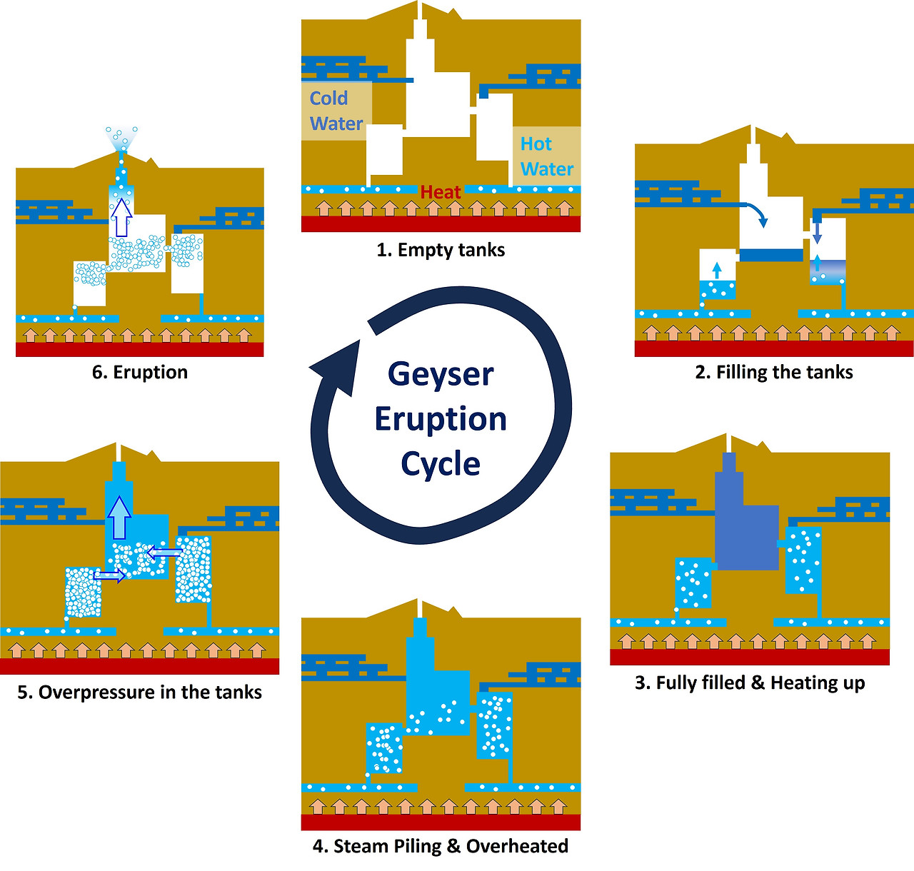 뜨거운 물이 땅 속에서 갑자기 솟아나는 현상은 땅속의 온도, 지하수 유량, 지하 지형 등이 복잡하게 여러 단계로 얽힌 물리 현상이다. 아마도 과거의 사람들에겐 미지의 혹은 미신의 영역이었을 텐데, 그래서 19세기 옐로우스톤을 최초로 탐험한 사람들의 이야기는 거의 60여 년간 '헛소리'로 치부당했다고 한다. 사진도 없던 시대라 이 신기한 현상을 믿을 수도, 이해할 수도 없었을 것이다. Geyser의 분출은 워낙 다양한 변수가 있어서 예측이 쉽지 않다. 불규칙한 경우도 많고 분출이 주기적이라 하더라도 주기가 수십 년에 달하는 것들도 많아서, 고작 며칠 다녀가는 관광객들이 여러 개의 Geyser 분출을 직접 보는 건 기본적으로 운이 좀 따라 줘야 하는 일이다.