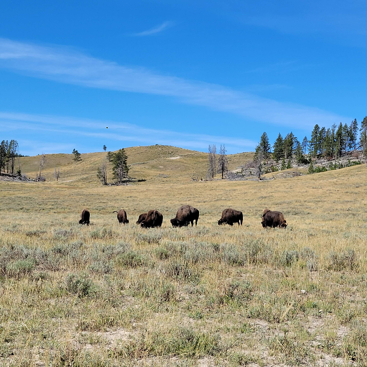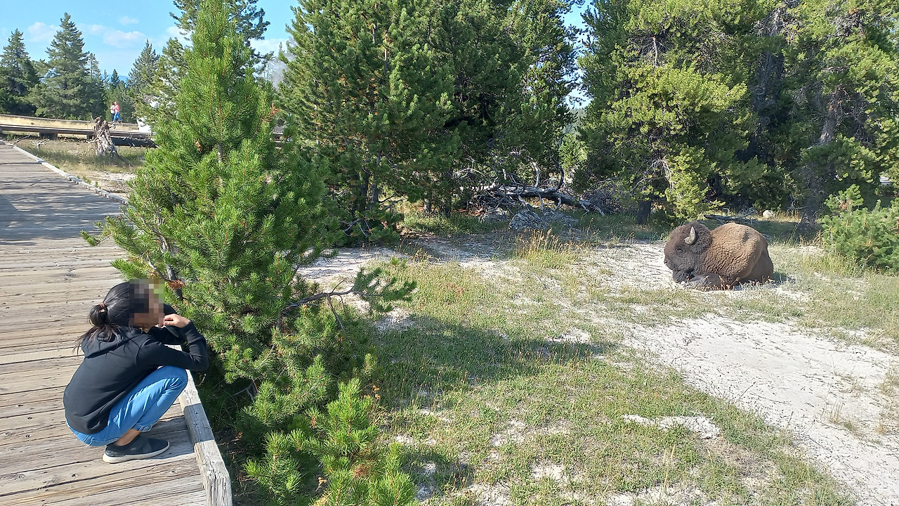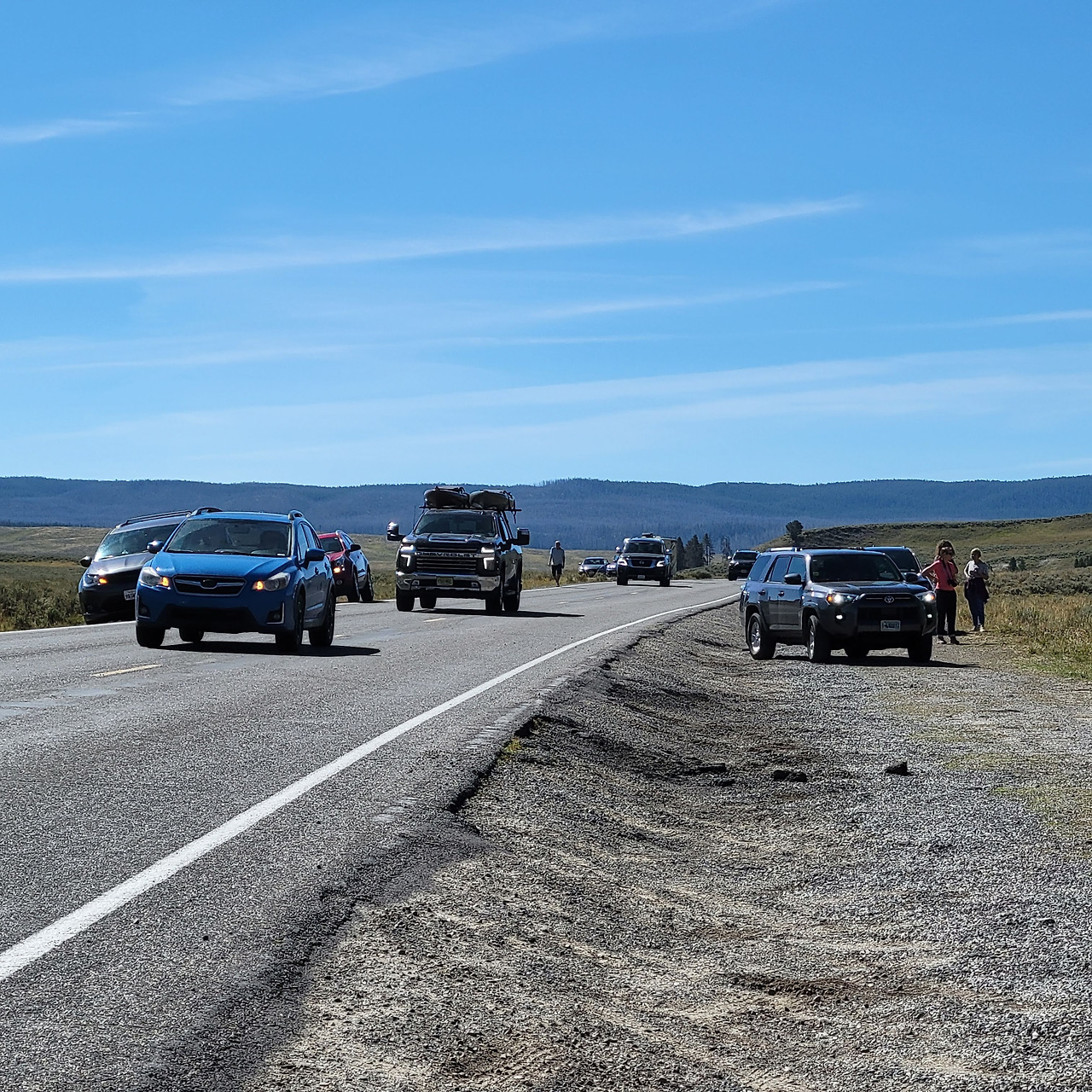운전하다 보면 야생동물도 종종 마주치게 된다. 특히 바이슨(Bison, Buffalo)이 많이 산다. 초원에도 있고 Mud Volcano에도 있고, 간혹 차 길로 나와서 차들을 가로막기도 한다. 이 길 위의 사람들은 어차피 바이슨도 보러 온 거라서 바이슨이 길을 막아준다면 그야말로 감사할 따름이다. 야생동물이 나타나면 구경하려는 차들이 일제히 서행을 하거나 갓길에 주차를 하는데, 뭐가 보이지 않더라도 남들이 차를 세우면 일단 따라 세울 필요가 있었다.