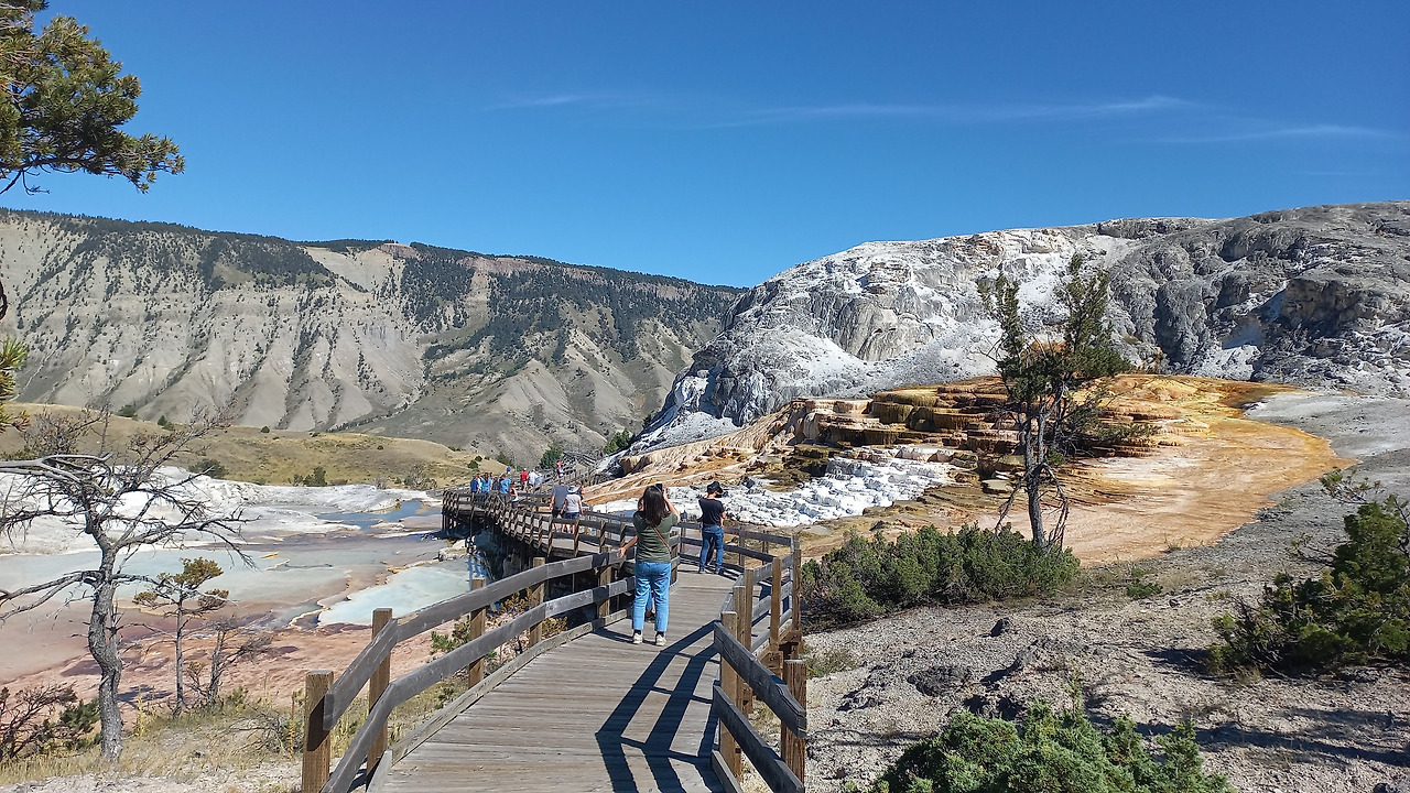 Fort Yellowstone 바로 옆에는 거대한 온천 지형 중 하나인 'Mammoth Hot Springs'이 있다. 실제로 매머드가 살았던 것은 아니고 그만큼 거대하다는 표현이다. 여기는 온천수가 나오는 곳으로 물속의 석회 성분이 퇴적되어 계단 같은 모양으로 만들어진 굉장히 독특한 모양의 큰 바위산이다. 전체적으로 주변과 대비되는 하얀 석회로 뒤덮여 있어서 멀리서도 알아볼 수 있다. 계단형태의 지형이 터키의 파묵칼레와 비슷하지만 온천수가 많이 나오지는 않아서 건조하고 황량한 느낌도 든다. Mammoth Hot Springs 정상에 올라서서 보는 Fort Yellowstone은 영락없는 서부시대 마을이다.