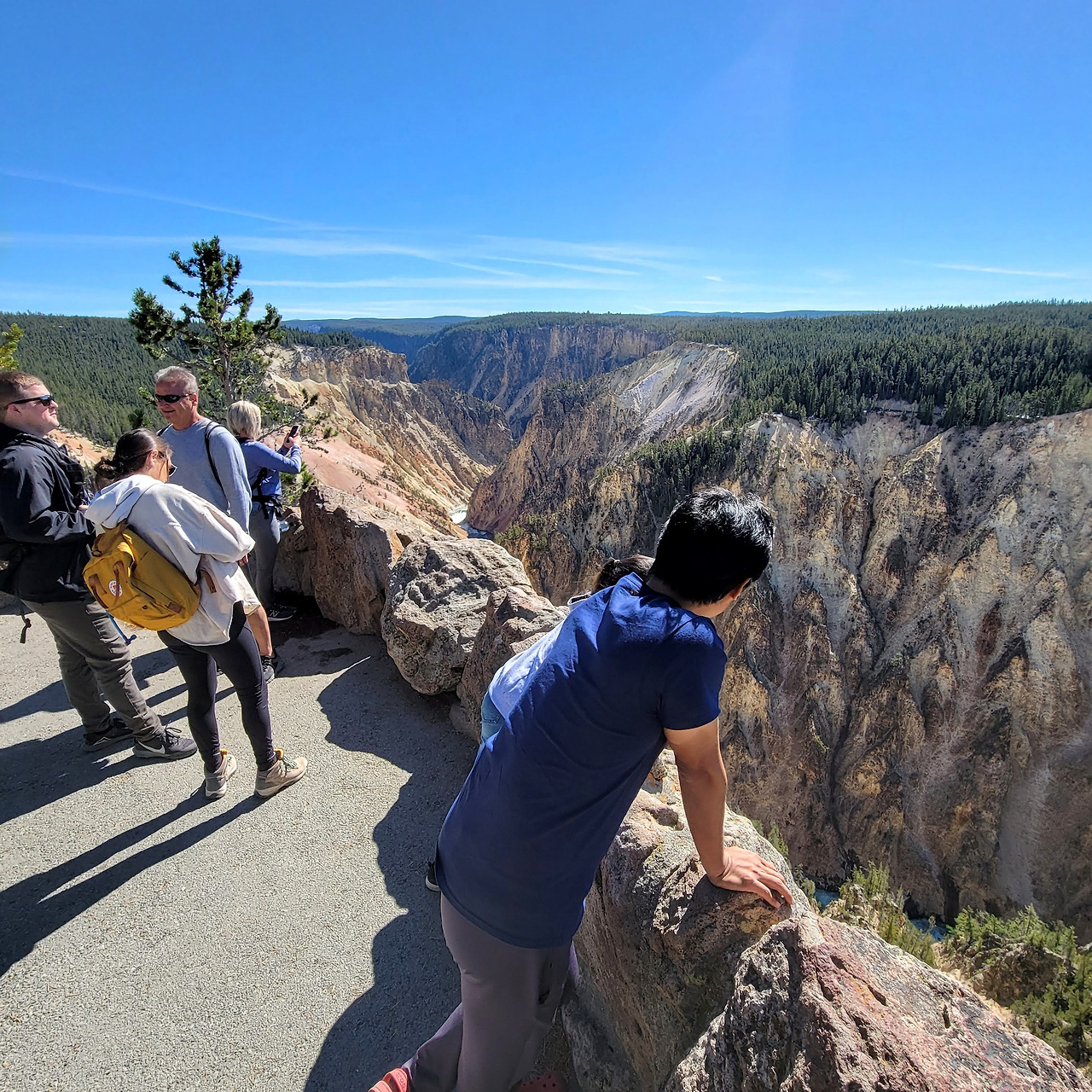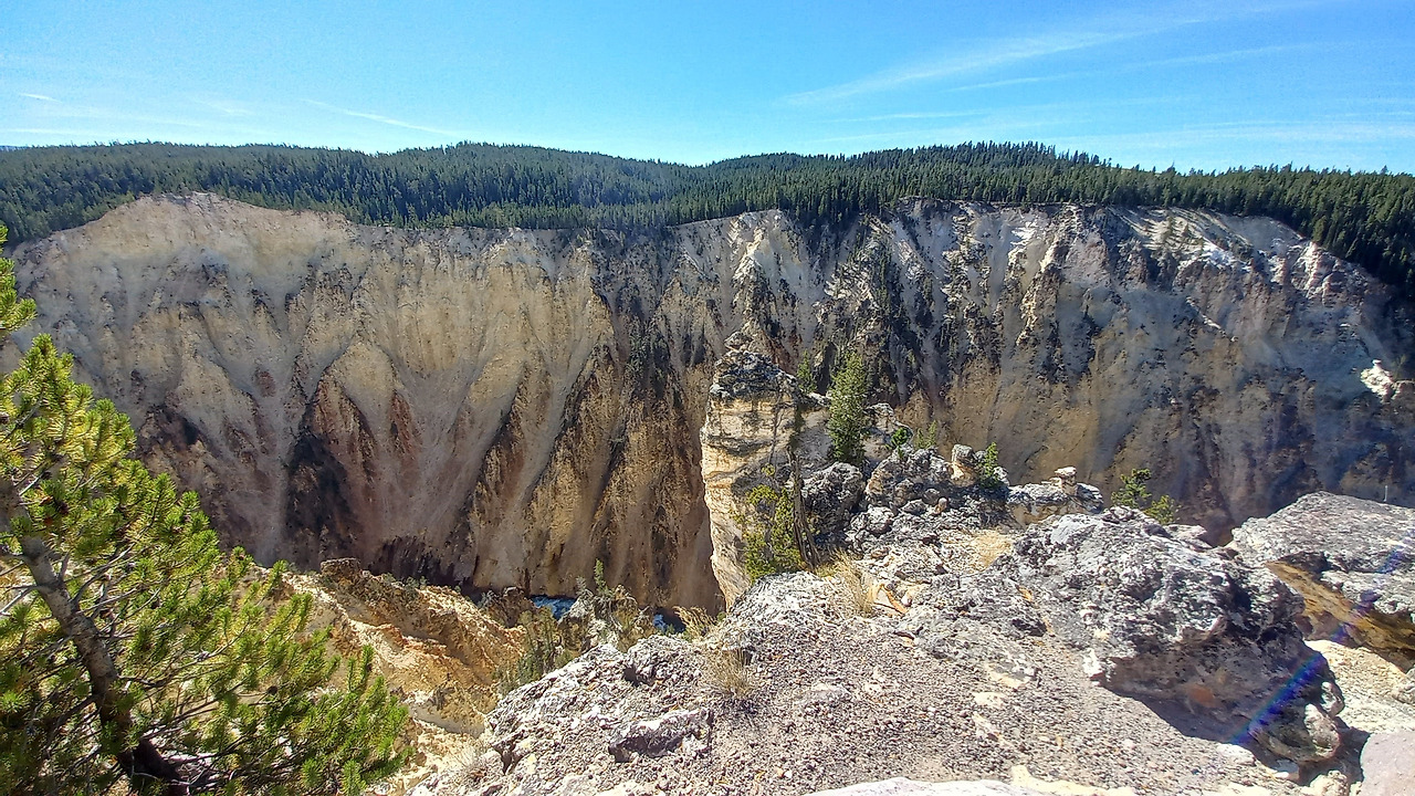 강이 흘러가는 바위 협곡은 매우 길고 깊이도 깊다. 이 협곡의 바위는 약간 노란색인데 그래서 이 지역을 'Yellowstone'이라고 부르게 되었다고 한다. (원주민의 지명 'Mi tse a-da-zi (노란 바위의 강)'를 뜻풀이 하여 영어로 바꿔 부른 것) 협곡 전망대에 올라가서도 바닥이 잘 보이지 않는데 까마득한 아래에 강이 흘러가는 게 보인다. 협곡 최대 깊이가 360m를 넘는다고 하니 건물 100층 정도 높이는 된다. 협곡의 길이는 30km를 넘기 때문에 그 끝이 보이지 않는다. 전망대 바로 아래는 절벽인데 휴대폰을 떨어뜨릴까 봐 사진 찍기도 무섭다.