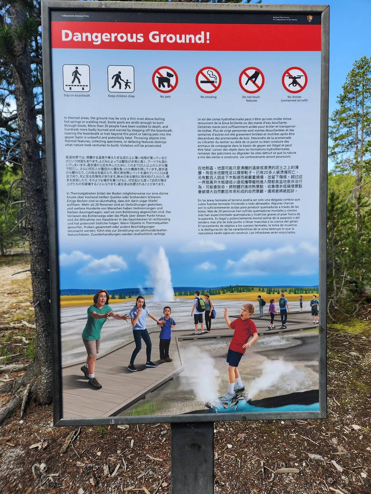 - 관광 장소마다 나무로 된 관람로가 설치되어 있다. 오염이나 지반 붕괴의 우려가 있기 때문에 관람객들은 관람로 밖으로 벗어나면 안 된다. 피어스 브로스넌이 Mammoth Hot Spings의 관람로 밖으로 무단으로 들어갔다가 $5,000의 벌금을 낸 일도 있다고 한다.