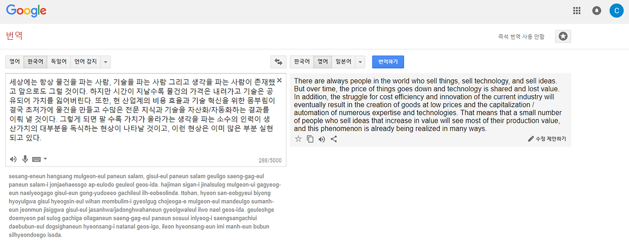 사회 초년생 시절 모 대기업에 취직한 후 나는 미국에서 오랜 시간 거주했다는 이유로 영문 번역과 외국인 경영자 지원업무를 주로 했다. 퇴사 후에는 한동안 프리랜서 번역가로 넉넉한 돈을 받으며 편하게 일한 적도 있다. 하지만 요즘 [그림 7]에서 보듯이 예전 내가 최소 10분은 투자해야 할 일을 단 1초 만에 단돈 1원의 비용 청구도 없이 제공한다. 시간 효율의 관점으로 보면 시스템의 성능이 나보다 600배 높다는 것이다. 인공지능 시대의 실직 대상자 대부분은 최소 이 정도의 능력 격차로 인해 순식간에 시장에서 쓸려나갈 가능성이 크다. 지렁이도 밣히면 꿈틀댄다는 말은 제대로 밟힌 지렁이를 한 번도 보지 못한 사람이나 할 수 있는 말이다.