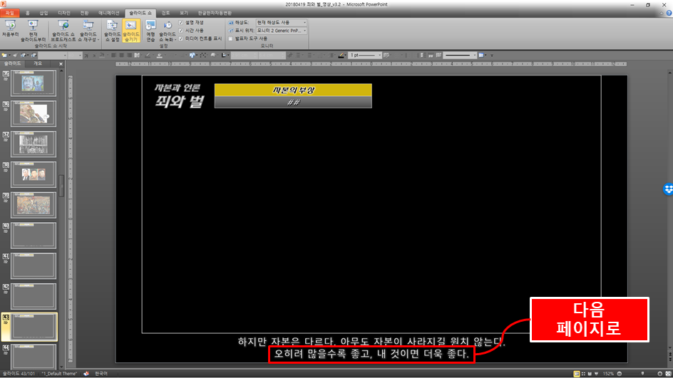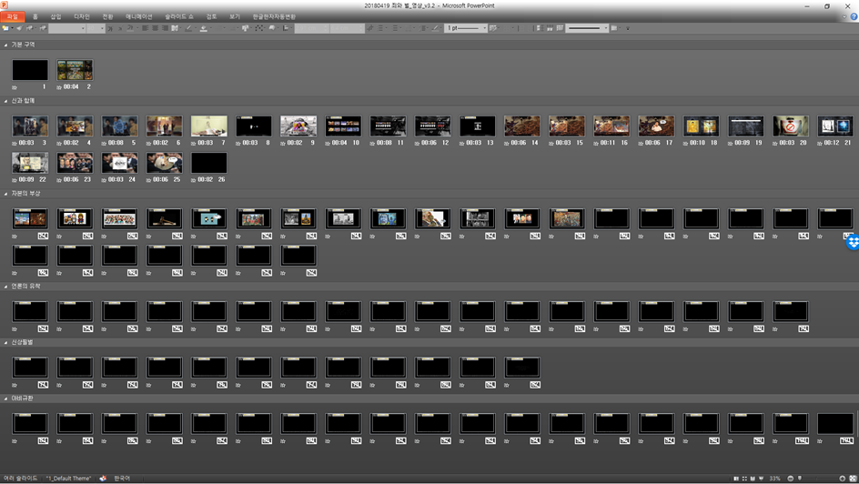 전체 글을 PPT로 옮겨놓고 작업하는 것이 좋은 것 같다. 그리고 워드나 한글 대비 페이지 수가 압도적으로 많아 지므로 [구역 나누기] 기능을 활용하면 편하다.