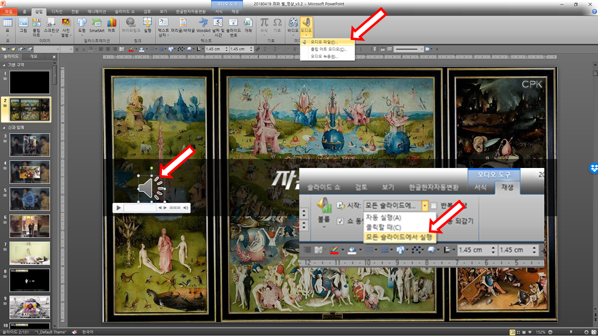 오디오를 삽입한 후 [모든 슬라이드에서 실행]을 선택하면 슬라이드 쇼가 시작하며 음악이 실행된다.