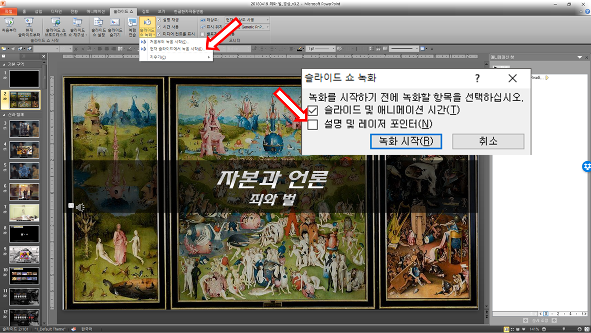 [슬라이드 쇼 녹화] 기능을 써 슬라이드 넘기는 타이밍을 저장해두면 전체 화면에서 영상처럼 자동으로 페이지가 넘어간다.