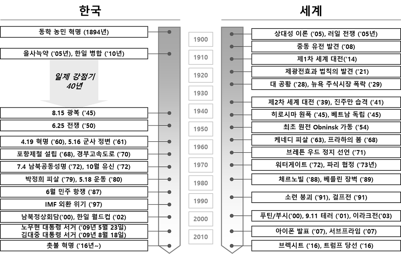 지난 한 세기를 돌아보면 우리나라의 근현대사는 참으로 기구하다는 생각이 든다. 이미 18세기 유럽과 미국 등지에서는 유혈 시민혁명을 통해 권력 지배구조를 재편했던 반면, 그릇된 유교 문화에 길들여진 우리는 왕이 외세를 끌어들여 백성을 몰살한 동학농민운동부터 시작해서 친일 식민지배가 끝나는 시점까지 우리는 단 한 번도 시민이 권력을 갖도록 허용된 적이 없다. 이후에도 수많은 독재권력과 싸우는 과정은 있었으나 그 결실은 시민의 품으로 돌아가지 않았다. 다시 말해 우리의 민주화는 시민 혁명을 통해 자주적으로 이룬 것이 아니고 냉전체제의 소용돌이 속에서 반쪽짜리 민주주의를 만들어 지금까지 명맥을 유지하고 있는 것이다.