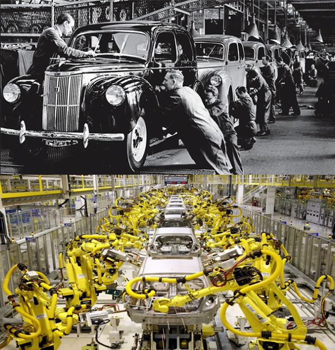 위의 그림을 보면 일반적으로 위쪽 사진의 노동자가 잃게 된 일자리에 관심을 집중한다. 하지만 생각해보자, 아래쪽 그림에 있는 로봇들은 누가 만든 건가? 근육을 사용하는 노동력을 제공하는 것에서 보다 창의적인 기술을 만든 것이 바로 인간의 뛰어남을 반증하는 것 아닌가?