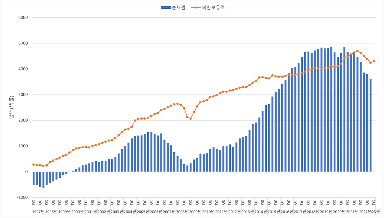 아주 단순하게 계산하면, 현재 외화보유액 4,300억 불은 5.7년 후 고갈된다. 대외금융자산 7,860억 불까지 고려하면 16.2년을 버틸 수 있다. 경제를 잘 몰라도 외환위기 소환은 다소 이르게 느껴진다.