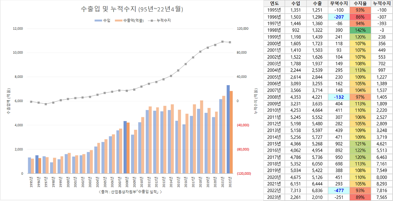 14년 만의 적자란 건 반대로 14년 간 흑자를 냈단 말이다. IMF 발생 이후, 2008년 한 해를 빼면 무려 25년 간 흑자를 냈다. 그 기간 무역수지를 합치면 7,565억 불, 한화로 1000조 원에 달한다.