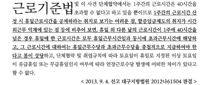 아래의 대구지방법원 2012나61504 판결에는 ①1주간의 근로시간은 40시간을 초과할 수 없다는 의미는 1주간의 근로시간 산정 시 휴일근로시간을 공제하라는 취지로 보기 어려우며, ②할증임금제도의 취지가 시간 외 근무 억제에 있는 점을 들어서 1주 40시간을 초과한 경우 근로시간은 휴일근무시간임과 동시에 초과근무(연장근로) 시간에 해당된다고 판단하고 있다.