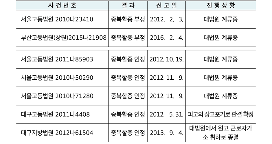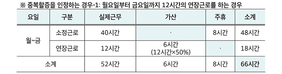 · 한편, 중복할증을 인정하는 판례는 ①근로기준법의 입법취지에 따라 근로자의 연장·야간·휴일근로를 억제함으로써 근로자의 건강과 인간다운 생활을 보호하려는 측면과 ②1주를 달력상의 7일로 해석하는 것이 자연스러운 해석이고 ③그동안의 잘못된 해석은 바뀌어야 할 대상에 불과하지, 그것이 오히려 잘못된 해석이 유지될 이유가 될 수는 없으며 ④근로자가 야간에 근로하는 경우 야간 근로시간은 실 근로시간에 포함되므로 휴일근로의 경우에도 중복할증을 인정하여야 한다 라고 하여 휴일근로수당과 연장근로수당의 중첩을 인정한다(2012. 11. 9. 서울고등법원 2010나50290 판결).