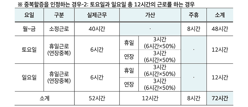 월요일부터 금요일까지는 연장근로가 없고, 토요일과 일요일에 각각 6시간씩 총 12시간의 휴일근로(연장근로)가 있다면 소정근로 40시간과 주휴수당 8시간 + 휴일근로(연장근로 중복 가산분 포함) 24시간(12시간+12시간×50%(휴일가산)+12시간×50%(연장가산)), 총 72시간으로 72만 원이 된다.