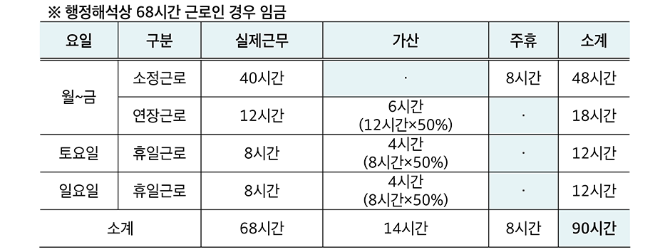 시급이 1만 원이라고 가정했을 때 68시간의 근로를 인정하고 있는 현행 행정해석과 52시간의 근로로 제한하는 판례의 입장의 임금 수준을 비교하면 다음과 같다.