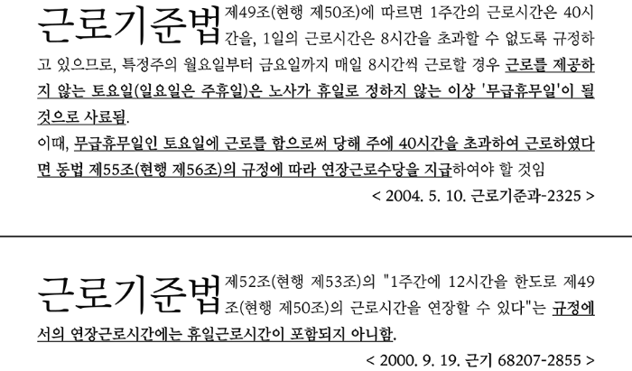 차이점이 있다면 행정해석은 토요일이나 일요일에 휴일근무가 가능한 반면에 판례의 입장에는 토요일과 일요일에 휴일근무의 가능성이 없다는 것에 있다.