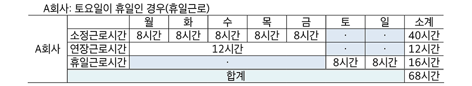 A회사가 이제 토요일을 '휴일'로 하여 토요일과 일요일에 각 8시간씩 '휴일근무'를 하고, 월요일부터 금요일까지 12시간 근무를 하게 된다면 총 근로시간은 다음과 같다.