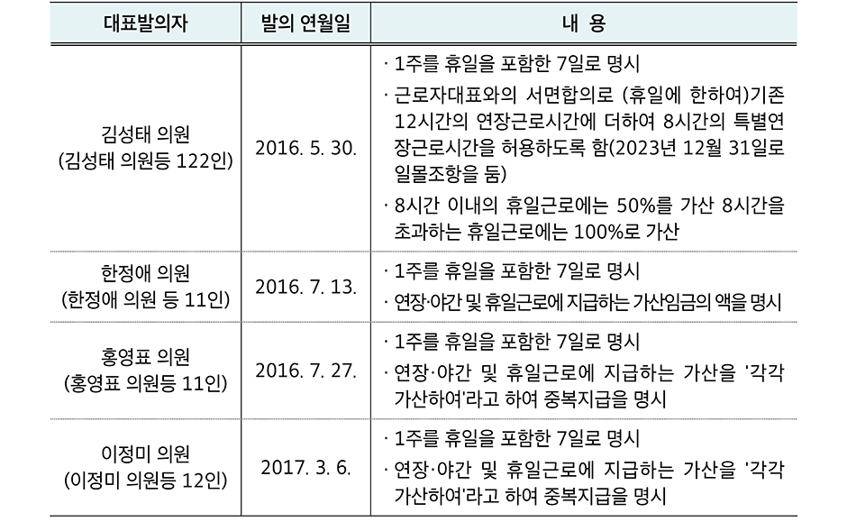 현재 발의된 근로기준법 개정안에는 공통적으로는 1주의 개념을 휴일을 포함한 7일로 명시하고 있다. 1주의 개념에 휴일을 포함한 7일로 명시한다는 것은 휴무일이든 휴무일이든 구분 없이 12시간 즉, 월요일부터 일요일까지 12시간으로 제한하겠다는 의미이다.
