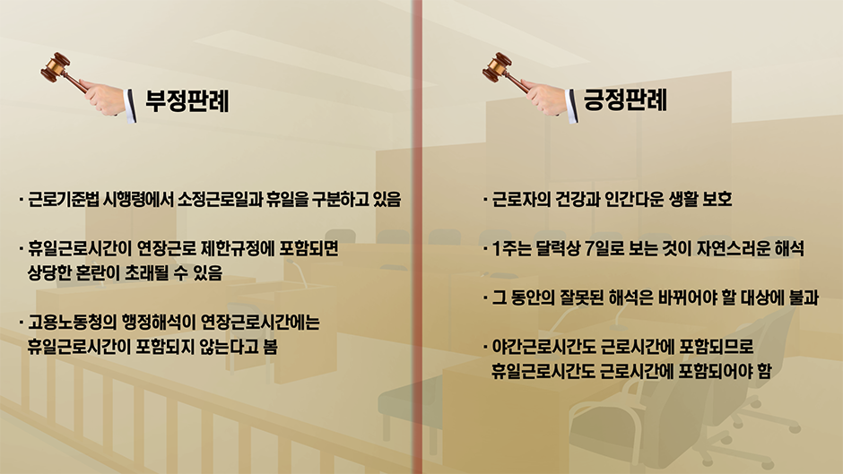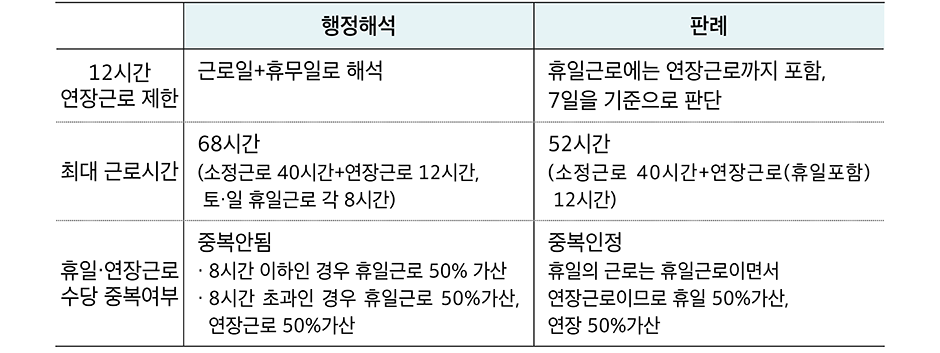 판례는 12시간의 연장근로시간 제한에서 휴무일·휴일이든 구분하지 않고 1주 7일을 기준으로 판단한다. 즉, 휴일에 근무하는 것은 휴일근로에 해당될 뿐만 아니라 연장근로에 해당된다는 입장이다. 가산임금의 할증에서도 판례는 행정해석과는 다르게 입장을 취하고 있다.