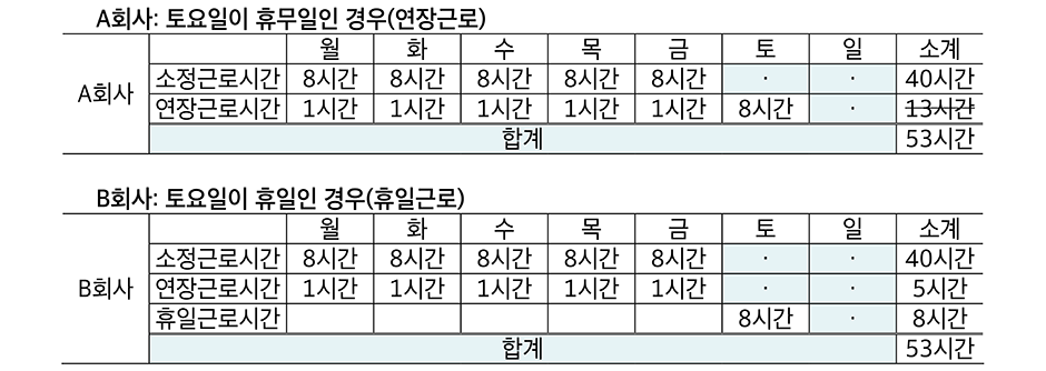 A회사와 B회사는 모두 월요일부터 금요일까지 1시간씩 연장근로를 하고 토요일에 8시간의 추가 근무를 하고 있다.