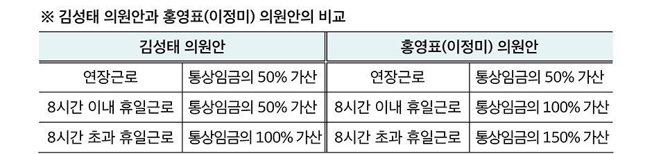 김성태 의원의 대표발의 개정안과 홍영표(이정미) 의원의 대표발의 개정안의 공통점은 1주의 개념에 휴일을 명시하여 1주의 연장근로시간을 12시간으로 제한하는 것에는 공통점이 있지만, 연장·휴일근로수당의 중복계산에는 상당한 차이를 보인다.