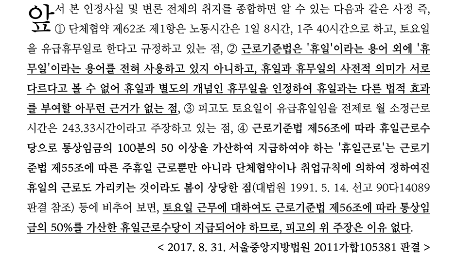 해당 사건에서 회사는 토요일의 경우 '휴무일'로 규정하여 토요일의 근무를 휴일근무에 해당하지 않고 연장근로에 해당하며 휴일인 일요일의 근무에 대해서는 8시간 이내의 경우에는 휴일근무에 대한 가산수당만 지급하면 되고, 휴일근무에 8시간을 초과하는 경우에 한하여 연장근로수당을 휴일근로수당과 중복 지급하면 된다고 주장하였다.
