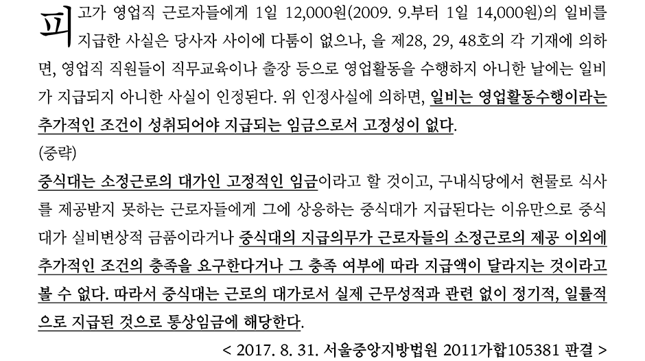영업직 직원들에게 지급하는 일비의 경우 교통비·활동비를 지원하기 위한 일환으로 지급하였는데, 판례는 일비는 영업활동 수행이라는 추가적인 조건이 성취되어야 한다고 하여 고정성이 없다고 판단하였다.