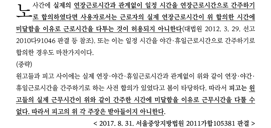 ②에 대해서는 노사 간에 실제의 연장근로시간과 관계없이 일정 시간을 연장근로시간으로 간주하기로 합의하였다면 실제 연장근로시간이 합의한 시간에 미달함을 이유로 근로시간을 다투는 것이 허용되지 않는다고 하여 ②부분에 회사의 주장은 받아들이지 않았다.