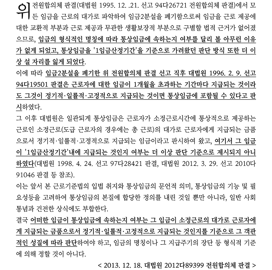 대법원 2012다89399 판결은 ①정기상여금이 통상임금에 해당되는지 여부, ②노사가 상여금을 통상임금 산정에서 제외하기로 합의했음에도 근로자가 그 합의의 무효를 주장하며 추가임금을 청구하는 것이 신의칙에 반하는지가 문제 되었으며