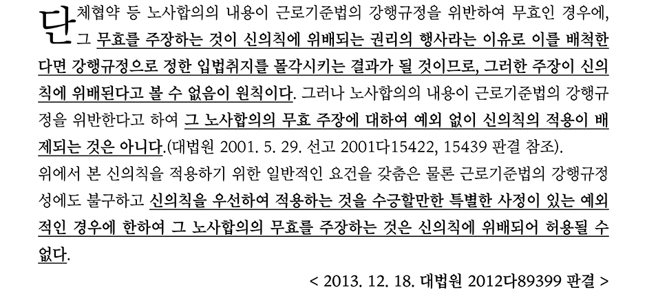 차이점이 있다면 신의칙 위반여부와 관련해서 갑을오토텍 사건과 달리 노사합의의 무효를 주장하는 것이 신의칙에 위반되지 않는다고 하였다는 것에 차이가 있다.