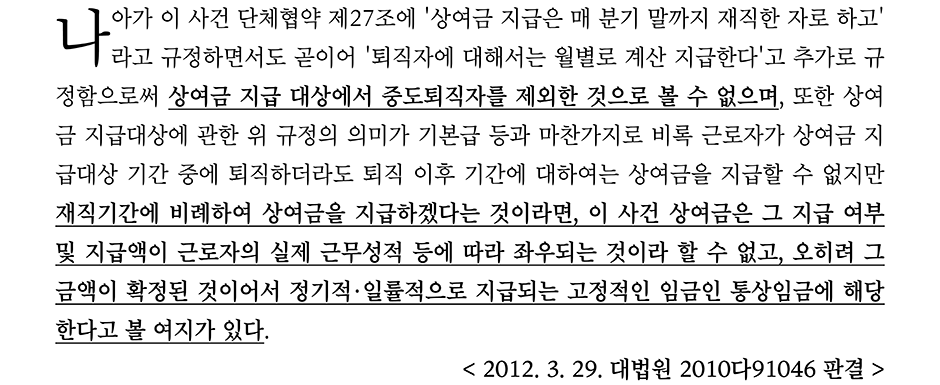 해당 사건에서는 단체협약에 상여금을 만근 기본급을 기준으로 6개월 이상 근무 시 근속연수에 따라서 상여금을 지급하며, 상여금의 지급시기는 1년 4회씩 분기별로 지급시기를 정하면서 '퇴직자에 대하여는 월별로 계산 지급한다'라고 규정을 두었다.