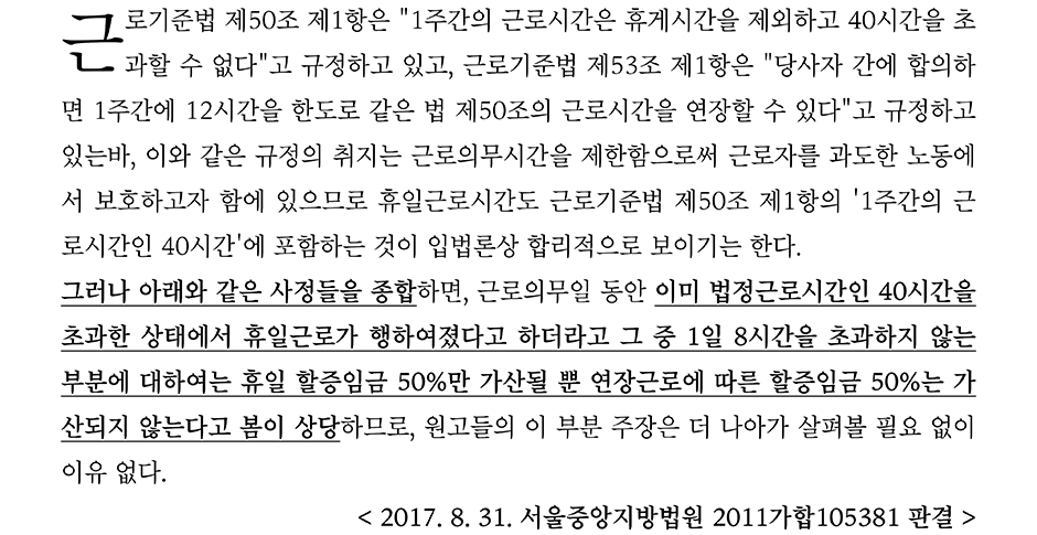 판례는 ①토요일(휴무일)의 근무에 대해서 근로기준법은 '휴일'이라는 용어 외에 '휴무일'이라는 용어를 사용하지 않으며, 사전적 의미가 서로 다르다고 할 수 없어 토요일의 근무는 연장근로가 아닌 휴일근로에 해당한다고 판단하였으며, ②일요일의 근무 즉, 휴일근무와 연장근로의 중복가산에 대해서는 별도의 입법적 조치의 필요·근로기준법상'소정근로일'과 '휴일'을 개념상 구분하고 있는 점 등에 따라 휴일인 일요일에 8시간을 초과하지 않는 경우에는 휴일 할증임금 50%만 가산하면 되고 연장근로수당까지 가산할 필요는 없다 라고 하여 8시간 이내의 8시간 이내의 휴일 근무시간에 대해서는 중복가산을 인정하지 않았다.