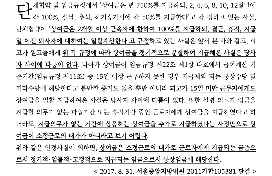 기아자동차의 통상임금 사건 역시 앞서 살펴본 갑을오토텍 사건과 유사하다.
